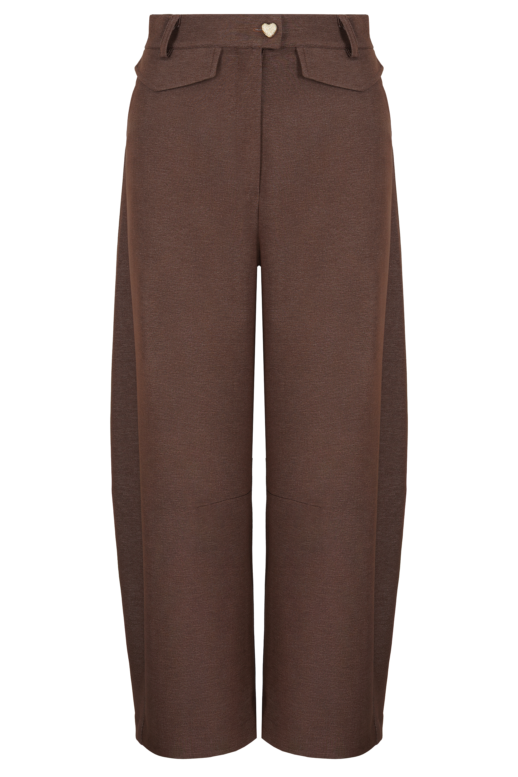 FAME BROWN TROUSERS są dopasowane w pasie i w linii bioder, dzięki czemu podkreślają kobiece proporcje, a następnie przechodzą w miękką, zaokrągloną formę nogawki inspirowaną krojem typu ballon. Ta konstrukcja nadaje sylwetce lekkości, a jednocześnie wyraźnej, świadomej formy.