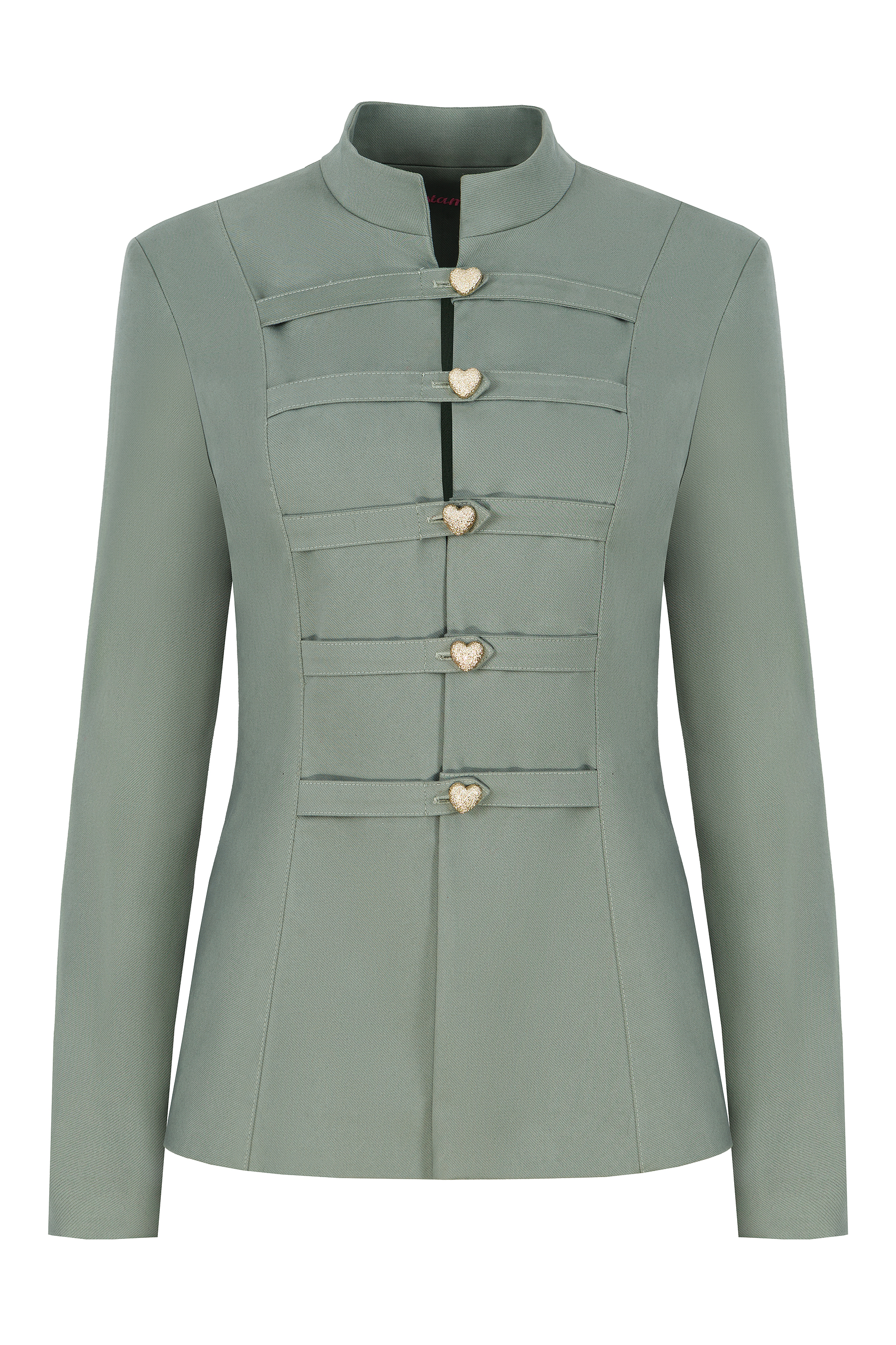 Całość dopełnia stójka — lekko odsunięta od szyi, o idealnie wyważonej wysokości. Wprowadza elegancję i delikatne odniesienie do estetyki wschodniej, zachowując jednocześnie nowoczesny charakter.